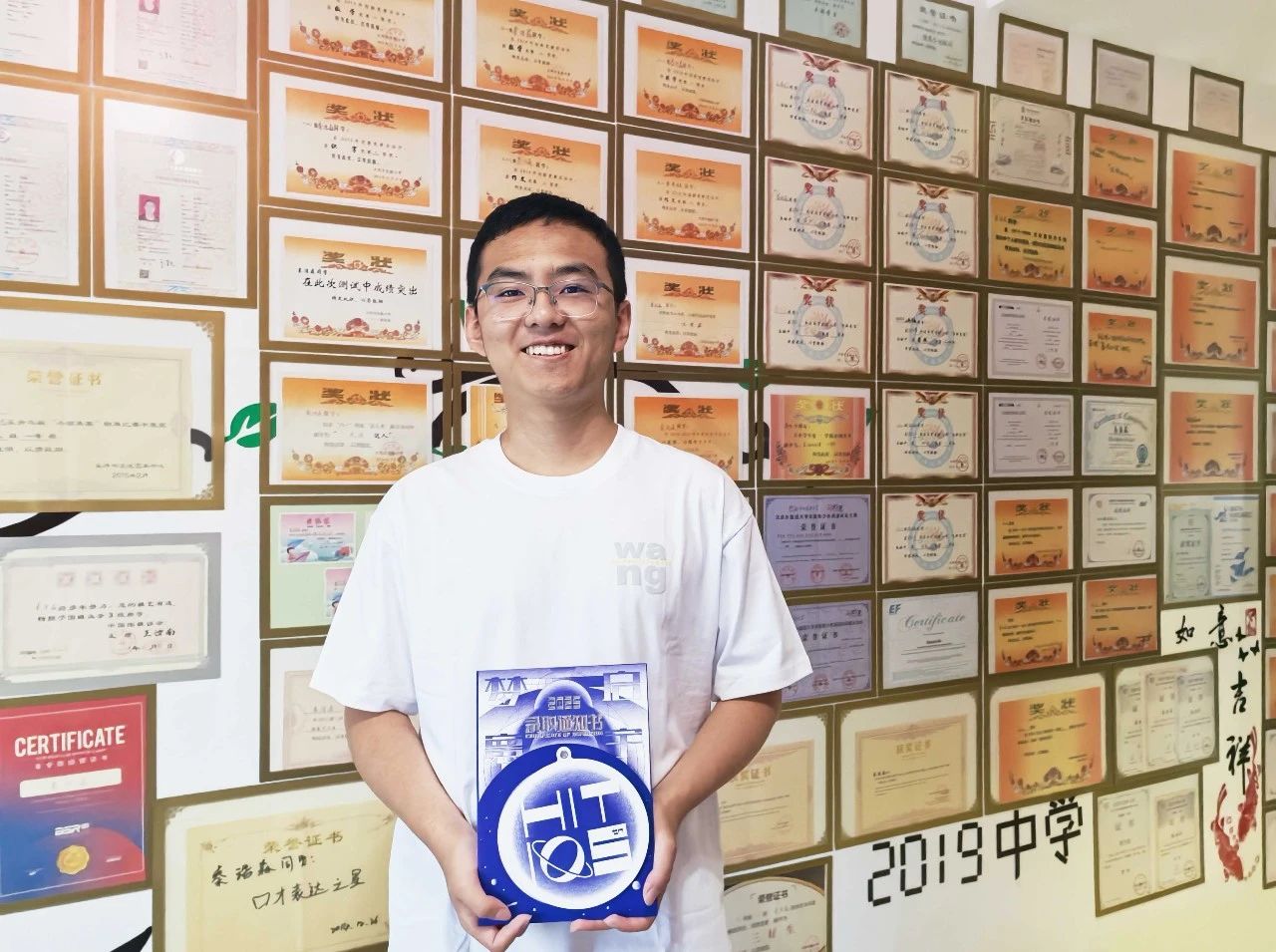 秦浩森在自己的獎狀墻前展示錄取通知書